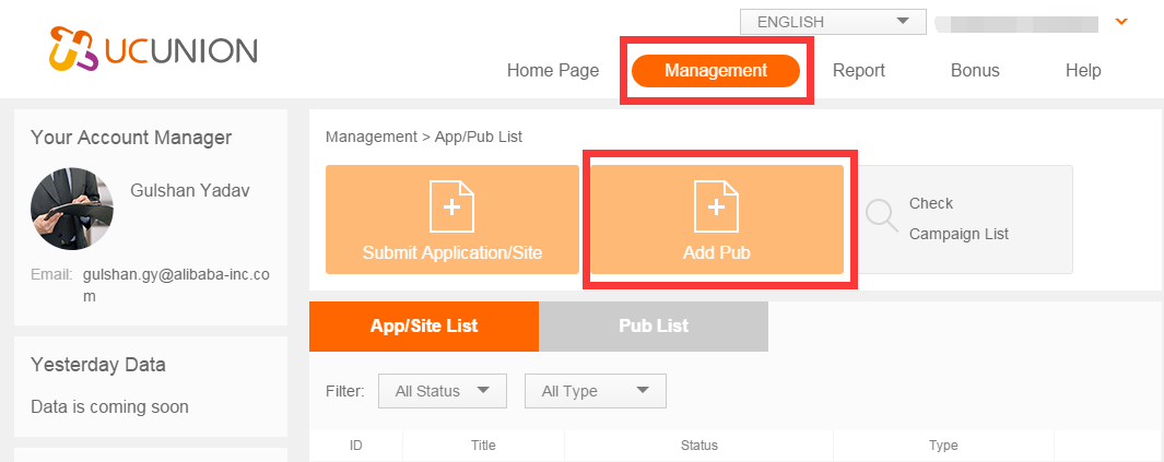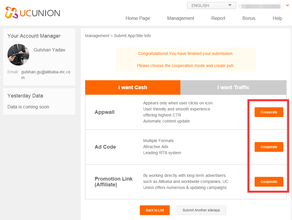1. After submit, UC Union will approve or reject your submit within 3 working days.2. After your sites or apps is audited, you will receive an email regarding the audit details.3. GET MONEY!!! Please fill in payment info and personal info as soon as possible. Please Click here: Payment Account.4. It is avaiable to check the data of all added/pending/rejected sites separately in Management tab.