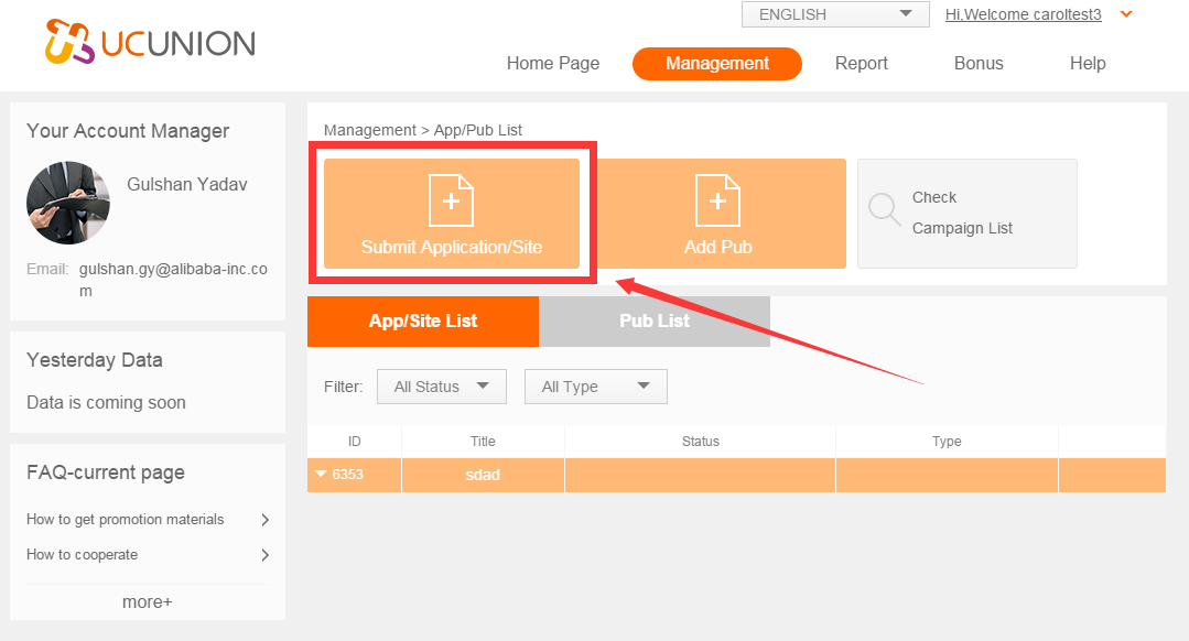 1.Log in UC Union, and go to Management tab. Click Submit Application/Sites button.